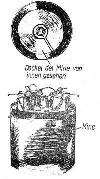 Der Minendeckel greift mit dem Rand in das Minengehäuse ein und wird mit vier Paar Verschlußhebeln solange am Minengehäuse festgehalten, wie der Salmiakring die Zünderfeder gespannt hält. Der Minendeckel schließt nicht wasserdicht. |