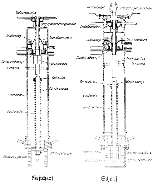 Am oberen Ende der Zünderstange befindet sich in einem Querblech ein Vierkant, der ein Drehen der Zünderstange verhindern soll. Die über dem Vierkant angebrachten Isolierringe verhüten bei der gesicherten Treibmine die unmittelbare Berührung der Zünderstange mit dem im oberen Teil des Zünderrohres befindlichen Kontaktring. Über dem Isolierring ist eine Gummimembrane angebracht, die das Zünderrohr gegen Wasser abdichtet. Über der Gummimembrane ist eine Preßspansicherung. |