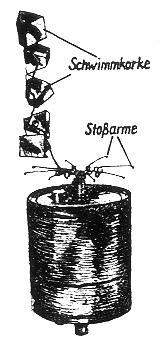 Zwischen den 8 Stoßarmen liegen 6 Schwimmkorke (Bild 93), die mit einer Schnur unter-einander und mit der Zünderstange verbunden sind. Jeder Kork enthält in einer Bohrung eine Druckfeder, die sich gegen den Minendeckel legt. Die restlichen Zwischenräume sind mit 8 losen Füllkorken zum Ausgleich des Deckelgewichts aufgefüllt. |