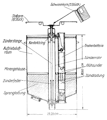 Zünder mit federnden Stoßarmen und Schwimmkorken, Trockenbatterie, Glühzünder und Übertragungsladung, rund 9 kg Sprengladung (gegossenes Trinitrotoluol). |