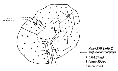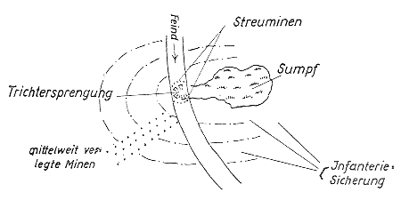 Minenfelder liegen häufig hinter der H.K.L. im Hauptkampffeld, um das Räumen vor Beginn des Kampfes zu verhindern. Vor der H.K.L. werden Minenfelder gegen Panzerkampfwagen durch Schützenminen gegen Räumen durch den Gegner gesichert. |