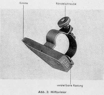 Das Hilfsvisier besteht aus dem Blechkörper mit Kimme und einer angenieteten Schelle mit Rändelschraube. Es ist in den auf dem Blechkörper angegebenen Entfernungsweiten von 25 m, 50 m, 75 m und 100 m durch Rastung verstellbar (Abb. 3). |