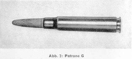 Die Patrone G ist eine Sonderpatrone Kal. 7,9 mm mit gelblichem Holzpfropf. Je 5 Patro-nen G befinden sich auf einem Ladestreifen. |