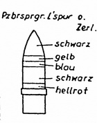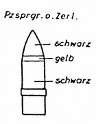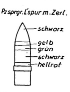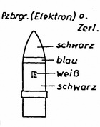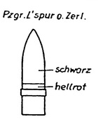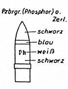 Die Beschriftung mit Fertigungskennzeichen, Lieferung, Rate, Jahr und Zusatkenn-zeichen erfolgt bei Pzgr. mit weißer, bei anderen Geschossen in schwarzer Farbe. |
