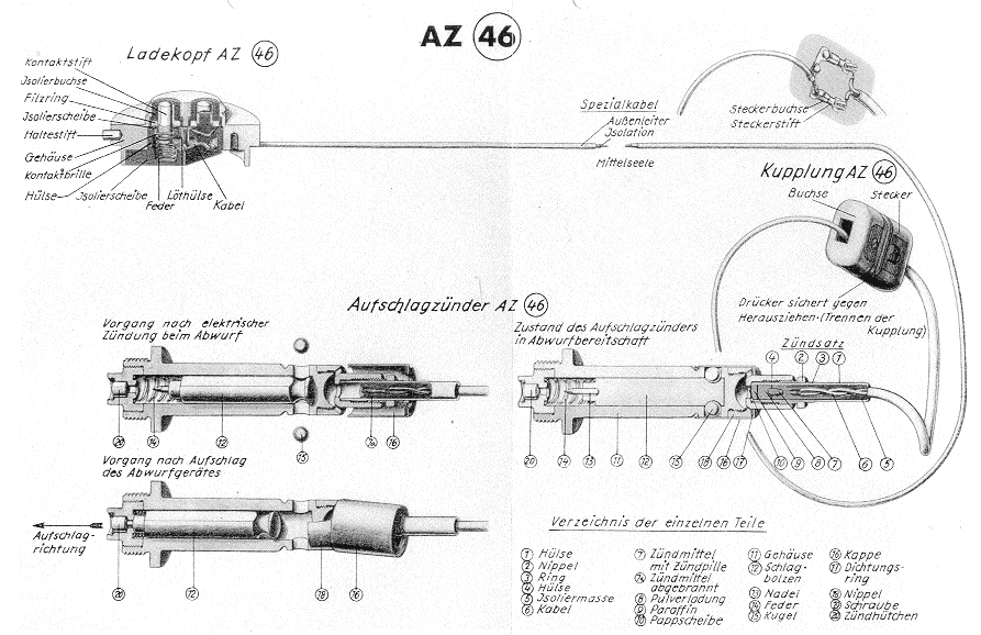 Beide Teile sind durch ein Kabel verbunden, in welcher zur Erleichterung des Einbaues des Zünders eine Kupplung liegt. |