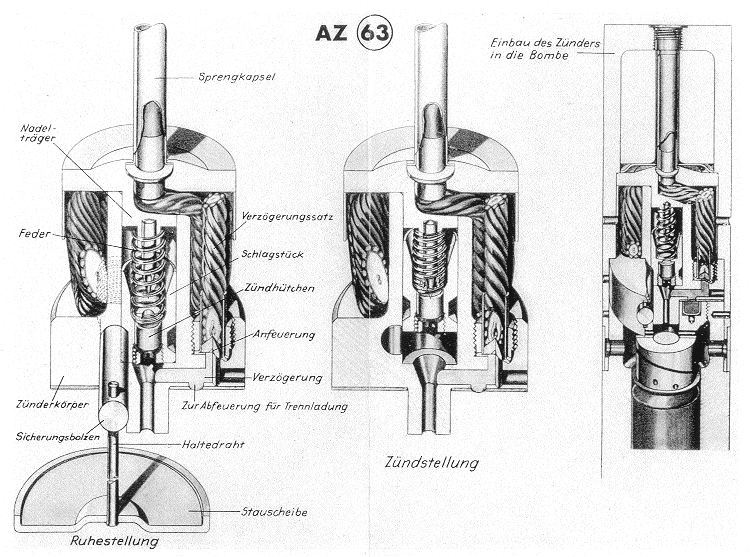 Der AZ (63) ist ein transport-, handhabungs-, beladesicherer, sprengkräftiger Zünder. Er besteht aus einer einfachen einseitigen Aufschlageinrichtung mit Vorsteckersicherung und einer Zündschnur-Zeitzündeinrichtung. Der Zünder ist zusammen mit der Sprengkapsel in die fertige B 2 EZ eingebaut. |