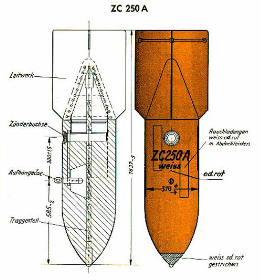 Die ZC 250 A, ZC 250 A weiß und ZC 250 C rot werden für den Bombenübungswurf bei Tage verwendet. Während die ZC 250 A (ohne Rauchladung) für den Übungs-wurf gegen Seeziele verwendet wird (aufsteigende Wasserfontäne markiert den Ein-schlag hinreichend), werden die beiden anderen Ausführungsarten für den Land-Übungszielwurf verwendet. |