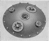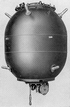 Auf der unteren Halbkugel sind 2 Bleikappen auf Schraubbuchsen, die in das Gefäß einge-lassen sind, ferner 1 Hakennase. In der Mitte unten ist die E.- Platte, außerdem läuft zentrisch zur E.-Platte eben darüber ein angeschweißter Ring. |