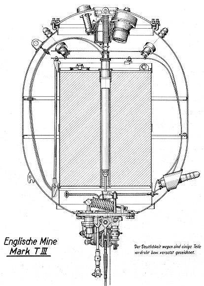 Die Z.E. arbeitet je nach Einstellung bis zu 45 Tagen. Nach Ablauf werden die Versenk-zünder im Deckel auf der oberen Halbkugel zur Detonation gebracht. Mine wird leck und sinkt – unscharf (kein Ankertauzug !) – auf den Grund. |