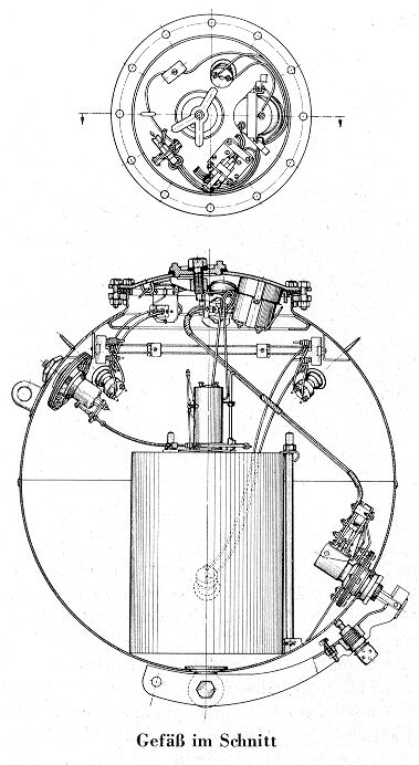 Der Wasserdruckschalter auf dem oberen Deckel ist fortgefallten. Dafür hat das Gefäß an der unteren Halbkugel einen doppelarmigen Hebel erhalten. Am kurzen Hebelarm ist das Ankertau befestigt, am langen Hebelarm sitzt an der Innenseite ein Bolzen, der auf eine Membrane drückt, der in eine Verschraubung in der unteren Halbkugel sitzt. Unter der Membran sitzt im Innern des Gefäßes ein Schalter mit Uhrwerksverzögerung. |