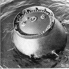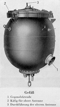 Um den oberen gewölbten Deckel, der einen Flansch abschließt, sitzt ein Kupferring als Elektrode. Auf dem Deckel sitzen seitlich 2 Tragaugen, 1 kleine Verschraubung, in der Mitte ein Handloch. Auf dem Umfang der oberen Halbkugel sitzen 3 Heißaugen und 4 Stoßkappen, auf dem Umfang der unteren Halbkugel 4 Stoßkappen und 2 Verschraubun-gen, davon 1 als Durchführung der unteren Antenne. Diese selbst ist als Bronzseil gefer-tigt und wird zugleich als Ankertau benutzt. |
