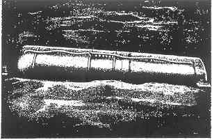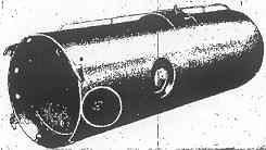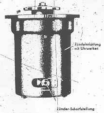 Zylindrisches Gefäß, welches auf der einen Seite druch einen runden Kopf, auf der ande-ren Seite durch einen nach innen gezogenen Deckel abgeschlossen ist. An diesem Gefäß-ende sitzen 4 hakenartige Nase, auf dem Gefäßkörper längs ein Eisendraht für die Befes-tigung der Magnete. Dazwischen ist eine Aufhängung mit 7 Bohrungen befestigt. Aus einer eingezogenen Öffnung ragt ein Handrad mit Beschriftung hervor (Abb. 99). In dieser Öffnung sitzt die Zündeinrichtung (2 Zeituhrwerke), die von 1 bis 10 Stunden einge-stellt sein kann. |