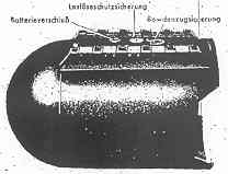 Schärfervorgang: Die Mine wird durch Losdrehen der Gewindespindel vom Bug des an-greifenden U-Boots gelöst. Hierbei wird ein Bowdenzug betätigt, der auf eine Kippvorrich-tung wirkt, auf der der Zünder sitzt, und diesen in Scharfstellung bringt. Gleichzeitig wer-den durch den Bowdenzug 2 Schalter eingelegt: Der eine schaltet den eigentlichen Zün-der in den Stromkreis ein, der andere gibt den Stromkreis zu einem zweiten Zünder frei, der einen Stößel einer Loslöseschutzvorrichtung solange festhielt. Gemeinsam in beiden Stromkreisen liegt ein Z.E.-Uhrwerk, das gleichfalls durch den Bowdenzug angeworfen wird. Nach kurzer Laufzeit des Uhrwerks wird die Batterie auf den Zünder der Loslöse-schutzvorrichtung geschaltet, dieser Zünder zerknallt und der bisher festgehaltene Stößel legt sich jetzt frei gegen die Bordwand. Wenn jetzt die Mine von der Bordwand gelöst wird, schließt der Stößel den Stromkreis Batter/Minenzünder und die Mine detoniert. Bleibt die Mine unbemerkt am Schiff haften, dann schließt das Z.E.-Uhrwerk nach der ein-gestellten Zeit den Zündstromkreis und die Mine detoniert ! |