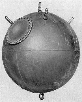 Kugelgefäß, welches auf der oberen Halbkugel 5 eiserne Bleikappenattrappen trägt. Seit-lich sitzt ein großer Deckel ohne Funktion. In der Mitte unten befindet sich ein Auge zum Befestigen der Verankerung (Kette I).