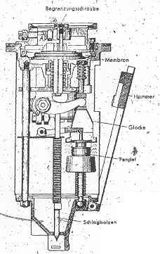 Durch Aufhören des Wasserdruckes wird die Sicherungsglocke in die obere Scharfstel-lung geschoben. Hierdurch wird der Hammer (Abb. 124) freigegeben, der sich nun von der Sicherungsglocke löst und auf die Versenkeinrichtung schlägt. Das Gefäß wird leck geschlagen und sackt auf den Grund. Da das einströmende Wasser einen Druck-ausgleich erzeugt, bleibt die Sicherungsglocke in oberer Scharfstellung. Beim Auf-schlagen auf dem Grund detoniert daher die Mine in den meisten Fällen.