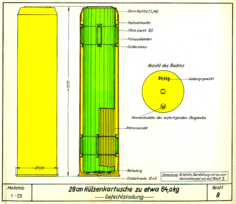 Blatt 7: 30,5 cm Hülsenkartusche zu etwa 87,1 kg - Gefechtsladung -Blatt 9: 28 cm Hülsenkartusche zu etwa 61,5 kg