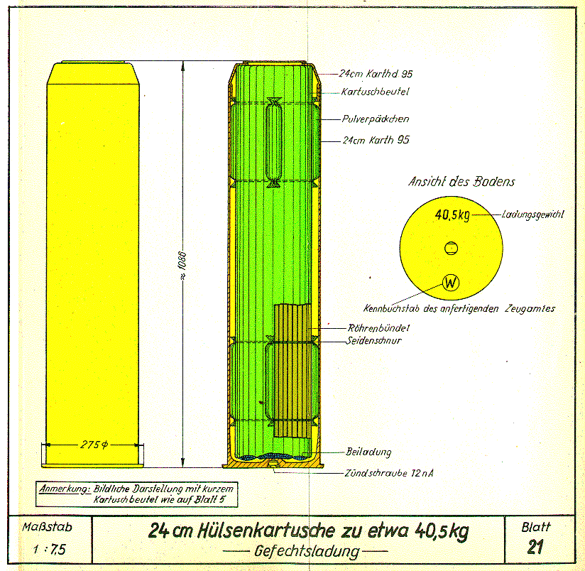 Blatt 20: 24 cm Hülsenkartusche zu etwa 36,4 kg - Gefechtsladung -Blatt 23: 21 cm Hülsenkartusche zu etwa 28,5 kg - kleine Gefechtsladung -Inhaltsverzeichnis