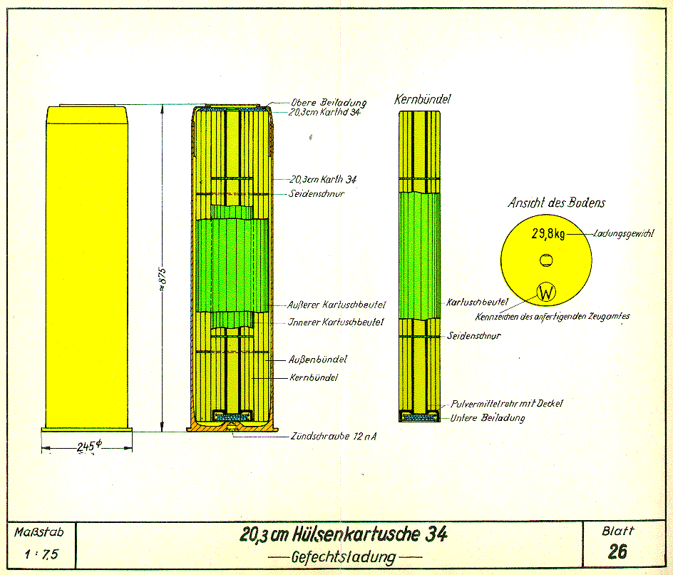 Blatt 25: 21 cm Hülsenkartusche zu etwa 29,5 kg - kleine Gefechtsladung -Blatt 27: 20,3 cm Hülsenkartusche 34 - Gefechtsladung -Inhaltsverzeichnis