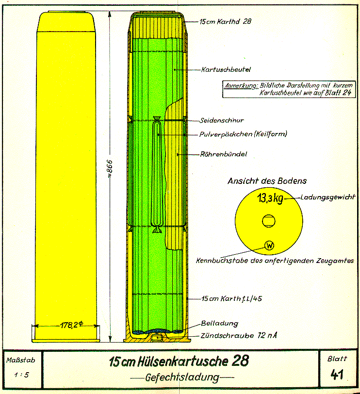Blatt 40: 15 cm Hülsenkartusche zu etwa 14,4 kg - Gefechtsladung -Blatt 42: 15 cm Hülsenkartusche 28 - Gefechtsladung -Inhaltsverzeichnis