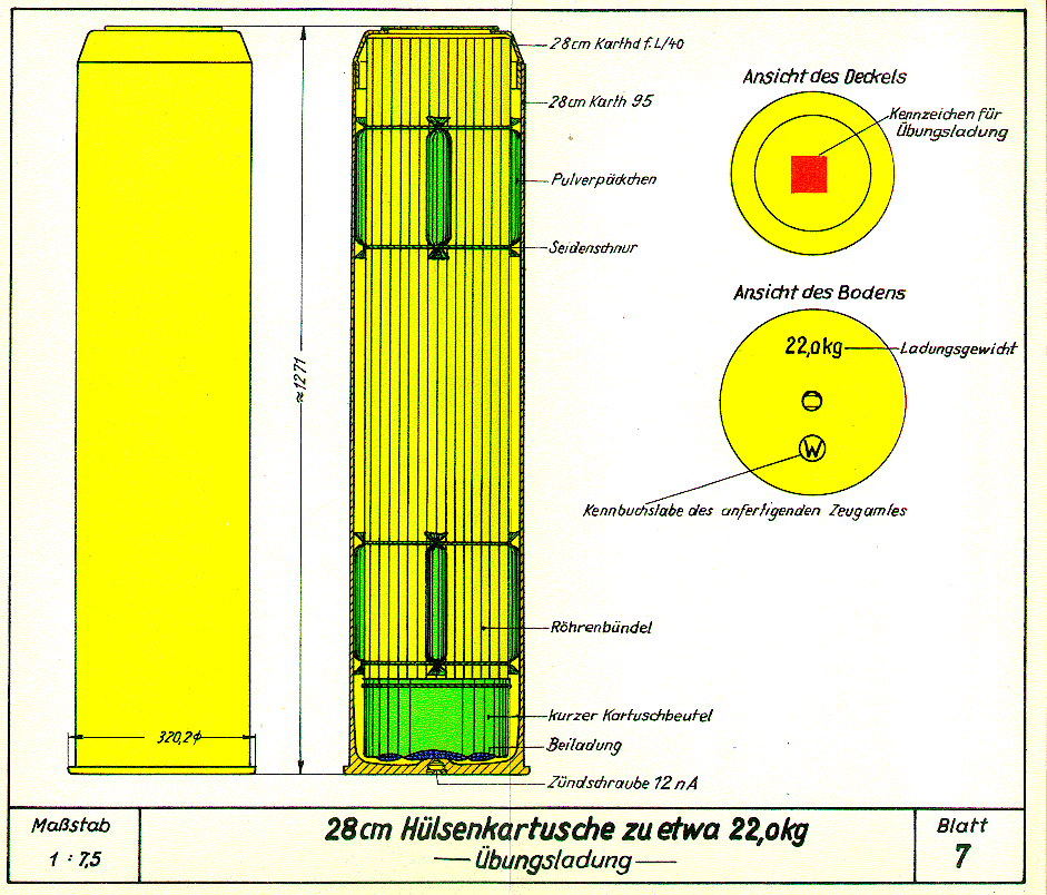 Blatt 5: 30,5 cm Hülsenkartusche zu etwa 45,3 kg - Übungsladung -Blatt 8: 28 cm Hülsenkartusche zu etwa 37,0 kg - Übungsladung -Inhaltsverzeichnis