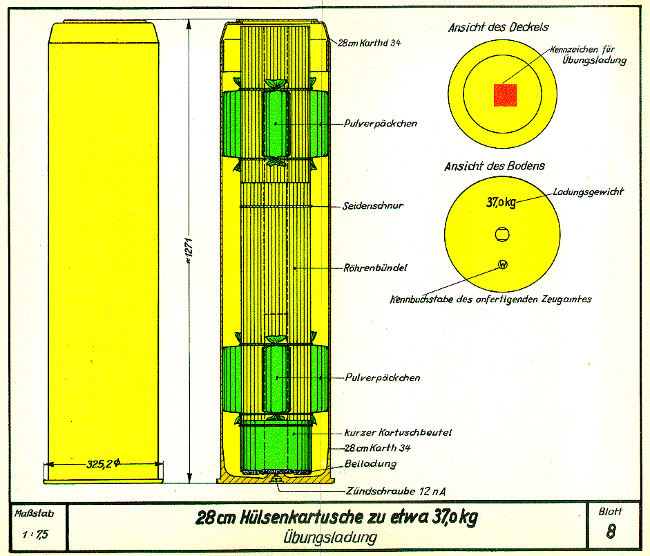 Blatt 7: 28 cm Hülsenkartusche zu etwa 22 kg - Übungsladung -Blatt 9: 28 cm Hülsenkartuschen 28 - Übungsladung -Inhaltsverzeichnis
