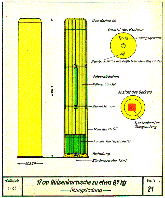 Blatt 20: 17 cm Hülsenkartusche zu etwa 7,6 kg - Übungsladung -Blatt 23: 15 cm Hülsenkartusche zu etwa 3,75 kg - Übungsladung -Inhaltsverzeichnis