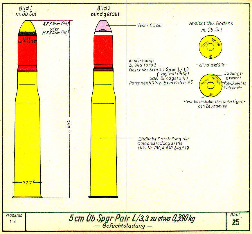Blatt 24: 7,5 cm Üb Spgr Patr 34 L/4,6 - Gefechtsladung -Blatt 26: 5 cm Üb Spgr Patr L/3,3 zu etwa 0,168 kg - Übungsladung -Inhaltsverzeichnis