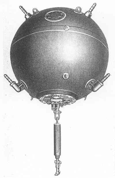 Besondere Merkmale: Das EMC-Gerät ist kugelförmig und durch einen an Umfang des Gefäßes aufgeschweißten Ring verstärkt. In die obere Gefäßhalbkugel sind 5 Bleikappen eingeschraubt, die untere Halbkugel ist mit 2 Kniestücken versehen, in die gleichfalls Blei-kappen geschraubt sind. Unten hat das Gefäß eine durch die Entschärferplatte verschlos-senen Öffnung. Die Entschärferplatte hat K.E.