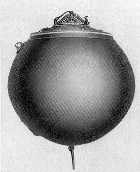 Besondere Merkmale: Das Gefäß hat Kugelform. Die große Öffnung der oberen Halbku-gel ist verschlossen durch einen aufgeschraubten Deckel, der oben eine durchbrochene Schutzglocke trägt. Unter dieser liegt eine Tiefenmembran. Über die Schutzglocke greift ein Bügel, der mit seinen Enden in den Aussparungen zweier Ansätze lagert und durch eine Schraubspindel festgesetzt wird. Der Bügel ist in der Mitte durchbohrt. Durch diese Bohrung führt ein Stropp zu einer Druckscheibe über der Membran. Der Stropp wird mit einem Salmiakbolzen an dem gabelförmigen Bock des Gefäßdeckels befestigt. Der Stropp dient zum Festsetzen der Membran vor dem Werfen. Nach dem Werfen löst sich der Sal-miakbolzen auf und gibt somit den Stropp frei. Der Wasserdruck kann die Membran nach innen drücken. |