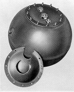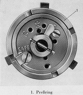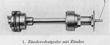 Besondere Merkmale: Das Gefäß der engli-schen Luftwasserbombe 425 kg hat Kugelform und ent- spricht im Aufbau ganz dem Gefäß der englischen U-Boots-Abwehrmine Mark XIX. Die Öff-nung des Gefäßes wird durch einen gewölb-ten Deckel, der an der Seite einen Ausschnitt zum Einströmen des Wassers besitzt, abge-schlossen. Darunter befindet sich ein eingezo-gener Deckel, der mit 3 in einer Reihe liegenden Öffnungen versehen ist. Die mittlere, größere Öffnung ist für die Einführung der Zündeinrich-tung vorgesehen, während die beiden anderen zum Eingießen der Ladung dienen. Die Zündein-richtung hat Tiefeneinstellungsmöglichkeiten von 50, 100 und 150 engl. Fuß (15, 30 und 45 m). Die Sprengbüchse ist stets in Scharf-stellung.