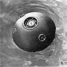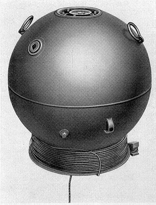 Besondere Merkmale: Gefäß hat Kugelform. Obere Halbkugel trägt 2 Heißringe, in etwa gleicher Höhe befindet sich ein Verschluß für die Sprengbüchseneinrichtung. Gegenüber etwa 10 cm über der Schweißnaht sitzt ein weiterer Verschluß für Versenkeinrichtung. An höchster Stelle des Gefäßes ist eine Öffnung für die Pendelstoßeinrichtung. Auf einem zy-lindrischen Ansatz am Gefäß ist das Ankertau aufgebracht. Unter dem Ansatz sitzt der Tiefensteller. |