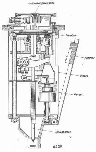 Beim Stoß gegen das Gefäß schlägt das Pendel aus, die unter Federdruck stehenden Schlagbolzen schlagen in die Zünder. Treibt das Gefäß auf und ist die Begrenzungsschei-be nicht eingesetzt, so wird die Sicherungsglocke wegen fehlenden Wasserdruckes bis in die obere Scharfstellung geschoben. Der Hammer der Pendelstoß-Einrichtung kann sich nun von der Sicherungsglocke lösen und schlägt auf die Versenkeinrichtung. Das Gefäß wird leck geschlagen und sinkt ab. Da das einströmende Wasser einen Druckausgleich er-zeugt, bleibt die Sicherungsglocke in oberer Scharfstellung. Das Aufschlagen des Gefäßes auf den Grund hat in den meisten Fällen einen Ausschlag des Pendels zur Folge und die Mine kommt zur Detonation. |