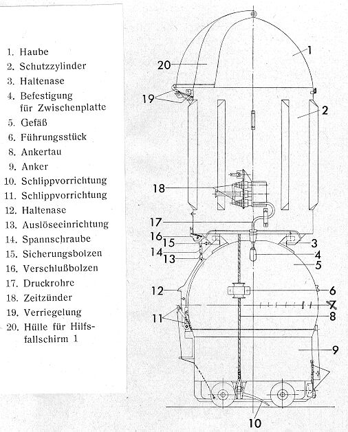 Besondere Merkmale: Die russische Flugzeugmine ist die russische Mine M 12, die mit Hilfe von 4 Fallschirmen vom Flugzeug aus geworfen wird. Eine Säureeinrichtung am Anker ermöglicht das Auslegen dieser Mine bei geschlossener Eisdecke. Im übrigen unterschei-det sie sich nicht von der russischen Mine M 12. |