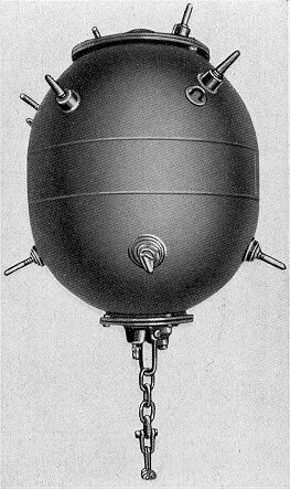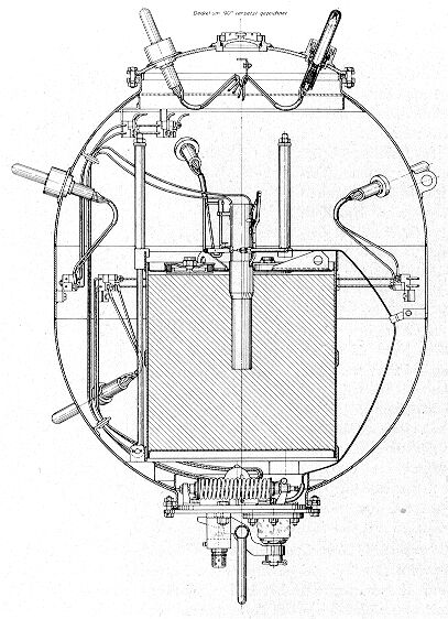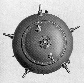 Die untere Halbkugel hat eine große Öffnung, die durch eine Platte verschlossen wird, die im Innern die Entschärfungseinsrichtung trägt. Die-se Entschärferplatte hat keine Zugstange, son-dern eine Hebeleinrichtung, durch die der An-kertauzug auf eine Entschärferfeder übertragen wird. Das Gefäß fällt durch seine Größe und durch seine stabile Bauart auf. |