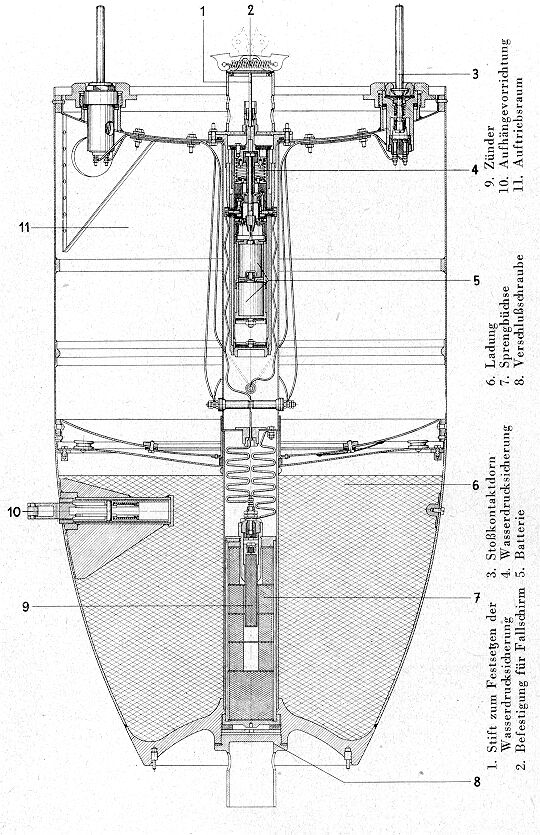 Scharfwerden und Zündung: Zum Scharfwerden der Mine ist ein gewisser Wasserdruck erforderlich, der durch das Eintauchen der Mine ins Wasser nach dem Wurf erzielt wird. Durch den Wasserdruck wird der Kolben und damit der Stecker der unteren Kolbenstange nach unten gedrückt, sofern er nicht schon von vornherein durch einen eingesetzten Stift in Scharfstellung gebracht worden ist. Gleichzeitig tritt durch die Bohrung im oberen Rohrende das Wasser unter die Batterie. Diese wird nach oben geschoben, wobei sich ein Kontaktstück der Batterie gegen den Stecker der Wasserdrucksicherung legt. Die Batterie wird in dieser Stellung verblockt. Der Stromkreis Batterie – Zünder ist nur noch in den Stoßkontakten unterbrochen. Durch Umlegen eines oder mehrerer Stoßkontaktdorne wird der Zünderstromkreis geschlossen; die Mine zerknallt. |