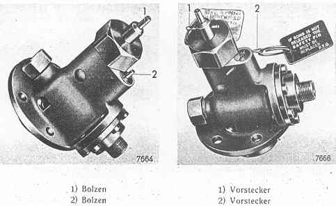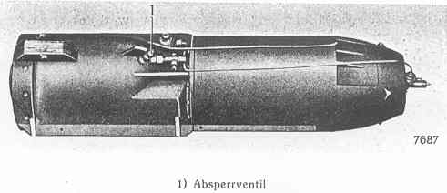 Entschärfen: Hat die Mine nicht gezündet, und ist der Sicherungsdraht aus dem Zwi-schenventil des Preßluftbehälters herausgezogen, so ist größte Vorsicht geboten. Das Absperrventil am Preßluftbehälter darf nicht geschlossen werden, da sonst der Schlag-bolzen entsichert wird und die Mine zur Detonation kommt. |