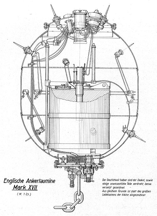 Besondere Merkmale: Die englische Mine Mark XVII A oder B ist eine Voreilgewichtsmine mit 11 Stoßkappen und wird von Überwasserfahrzeugen geworfen. Der gewölbte Deckel der oberen Halbkugel des Gefäßes entspricht in der Ausführung dem Dek-kel der Mine Mark XVI. Auf dem Deckel sind zwei Versenkeinrichtungen (Z.E.) wie bei der Mark XVI angebracht. Unter dem mittleren Handlochverschluß ist in einem eingehängten unten offenen Topf eine zylindrisch geformte 3-Volt-Batterie eingesetzt. Der Topf ist oben mit einem Deckel und Spannring derart verschlossen, daß die Batterie mit dem Topf nach oben herausgenommen werden kann. Der Handloch-verschluß ist durch einen Preßring mit Außengewinde festgeschraubt. |