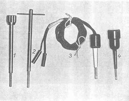 2) Prüf-Kontaktschraube mit Griff und 4) Prüfstecker mit Lampe werden nur zum Prüfen der G.E. II gebraucht und befinden sich nicht im Werk-zeugkasten zum Entschärfen von LM und G.E. |