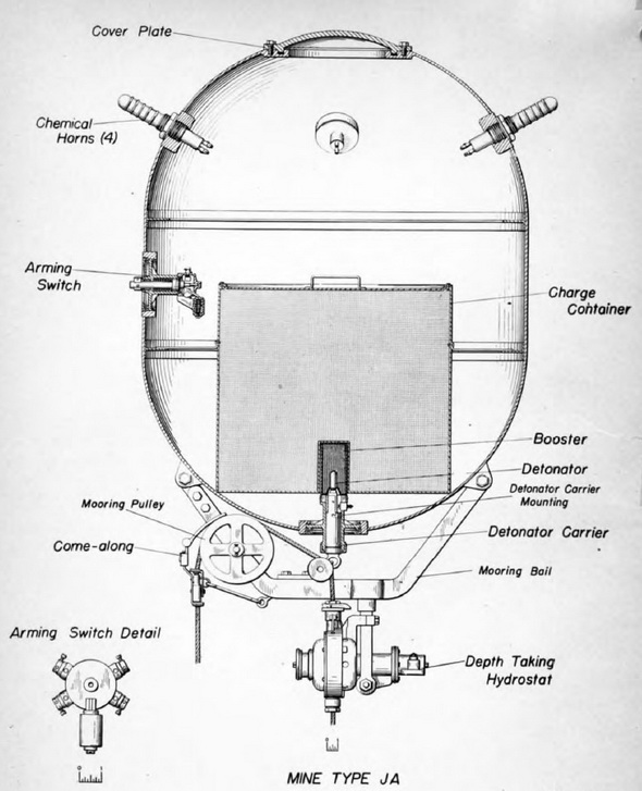 The JA is designed to disarm, if the mooring cable breaks, by having a come-along pull out the detonator carrier when the mooring cable reeves back through the hydrostat and over the mooring pulley. The design, however, is by no means dependable and the mine should always be assumed to be in dangerous condition if found adrift or on the beach. |