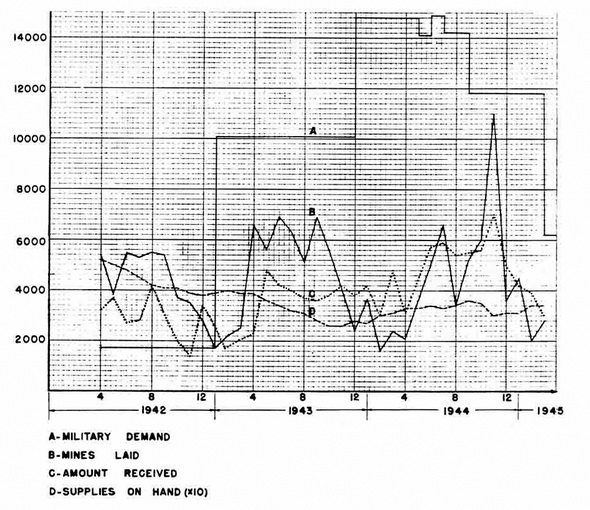 The second period, from the introduction of the magnetic-acoustic mine in the Sum-mer of 1941, to the end of 1943, was one of steady research but no essential novelties. In April 1942, the German Navy had approximately 50,000 mines of all types ready for operational use. Through 1942 the monthly demand for mines was extremely low and at a constant level. Subsequently, as Allied action became more aggressive, especially in the Mediterranean, the demand accelerated. Ironically, now that no new weapon were com-ing out and successful countermeasure for the old ones were in operation, the Luftwaffe took mining more seriously and put forward its biggest minelaying effort. |