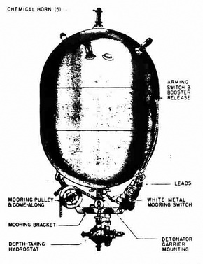 The mine existed in two models, one for laying by surface craft and the other by sub-marine. Only the surface craft type was laid in World War II, since the other type requi-red specially fitted submarines which were not available. |