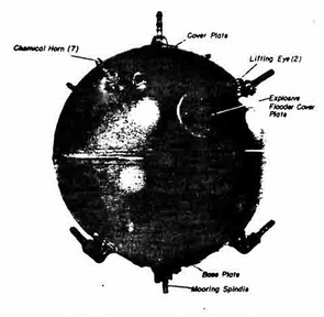 The EMC I Mine. The original EMC mine was completed in 1924. (Figure 7). It utilized a bronze base plate and an eighth horn (KE) which was placed on top of the mooring safety switch. In 1936 the mine was improved. The eighth horn was moved to the side of the mooring switch; a soluble plug was substituted for a dash-pot type of delay system; fit-tings were provided for antenna and scuttling devicies; and the base plate parts were redesigned to give greater life and watertightness. The improved model designated EMC II and the original type redesignated EMC I. |