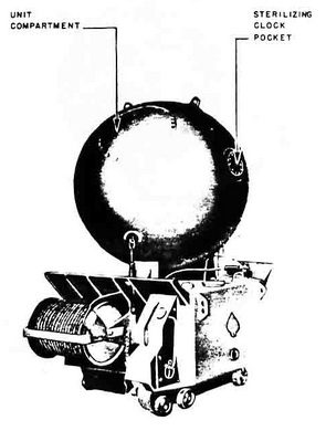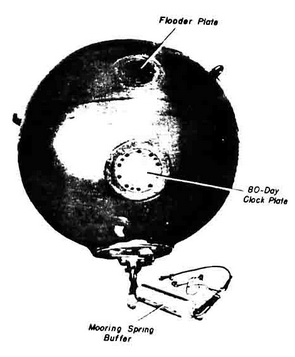 The first model was a spherical case consisting of two hemispheres welded together. Its flooder plate was located 26½ inches from the center of the upper hemisphere; how-ever, there were no provisions for an 80-day clock. In the final model the case was im-proved in construction; a soluble plug and disarming switch were added; and the depth taking mechanism was improved. |