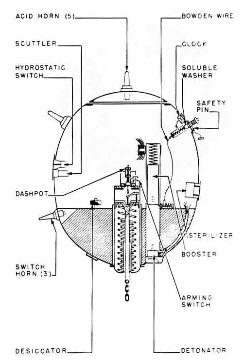 The method of placing the main charge in the EMK and EMU differs from normal Ger-man practice. Whereas all other German moored mines employ a charge container, the EMK and EMU were designed to house the charge on the bottom of the mine case. The German felt that loading the mines in this manner would give the mine a greater lethal range and permit better mine orientation. |