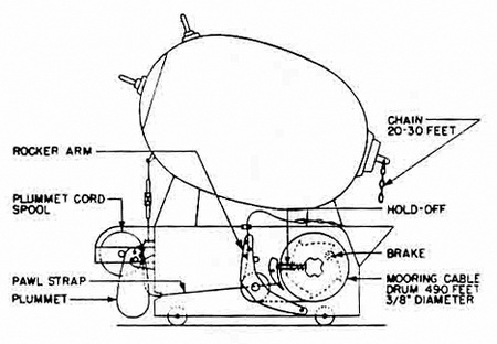 The anchor of the EMK and EMU mines was also of new design. Its most noteworthy feature was the fact that it was so designed as to permit depth setting either by plum-met or by hydrostat (Figure 23). The plummet-line drum was designed to accommodate 100 feet of 3/16-inch cable, and the mooring-cable drum 500 feet of 7/16-inch cable. An 18 - 30-foot length of chain was to be used between mooring spindle and mooring cable. Because of its departure from previous German types, the development of this anchor progressed slowly and was not completed at the end of the war. |