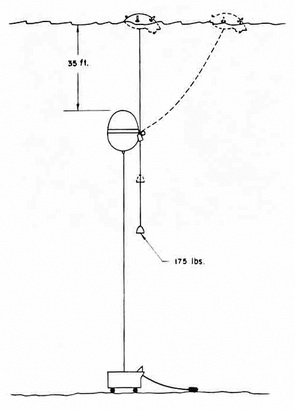 With the development of OMA/K the problem of preventing excessive drifters was suc-cessfully met for depths up to 50 feet. (The OMA/K, when tested in the extremely rough waters of the Elbe Estuary, lasted for more than five months.) However, since the buo-yancy of the OMA case precluded the use of a double chain mooring in depths over 50 feet, the problem remained unsolved for use in greater depths. |