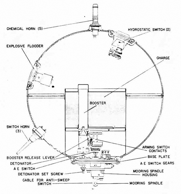 Operation. The depth of the mine case its preset and determined by the amount of mooring cable used. Mooring tension rulls out the mooring spindle, closing the mooring safety switch, tripping the booster-release lever, and the mine is armed. |