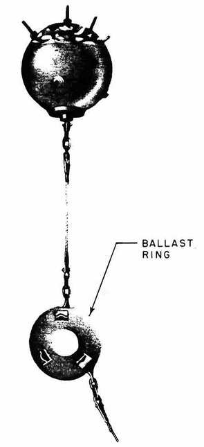 The assembly is so designed that the mine case remains on the surface, regardless of the stage of the tide. It may be laid in depths of 85 to 165 feet. For depths of 85 to 150 feet, a 65-foot mooring cable is used between the mine case and weight: for depths of 100 to 165 feet, the mooring-cable length is increased to 85 feet. In both cases, the mooring cable between the anchor and weight is 165 feet in length. |