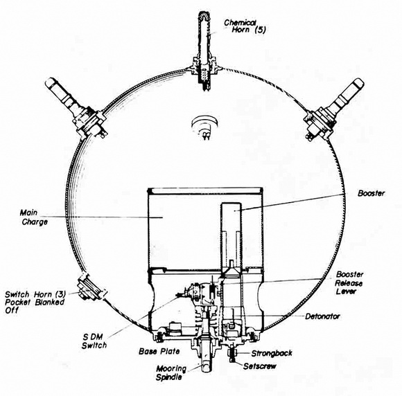 Operation. The mine takes depth by plummet. The hydrostatic switch closes in six feet of water (if red screw plug is fitted, switch is permanently closed) and, if the mine moors at a depth greater than that set on the anti-shallow-plant hydrostatic switch, the flooder circuit is broken. Dissolution of a soluble plug allows mooring tension to pull out the mooring spindle, closing the mooring safety switch and tripping the booster-release lever, and the mine is armed. A spring-loaded detent is usually fitted to lock the mooring spindle out. |