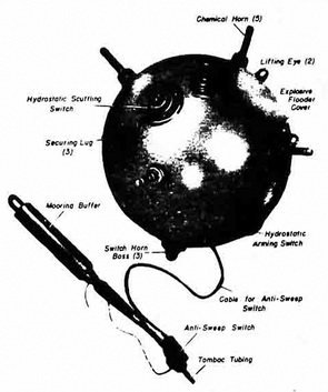The mine has standard chemical or switch-horn firing. An additional firing method may be incorporated by fitting a "tombac" anti-sweep tubing to the mooring cable. Upward movement of this tubing along the mooring cable, such as might be caused by sweep wire contacting it, will close a switch on the tubing and fire the main charge. Mines fitted with snag lines will not normally be fitted with the "tombac" anti-sweep device nor the locking detent on the mooring spindle. |